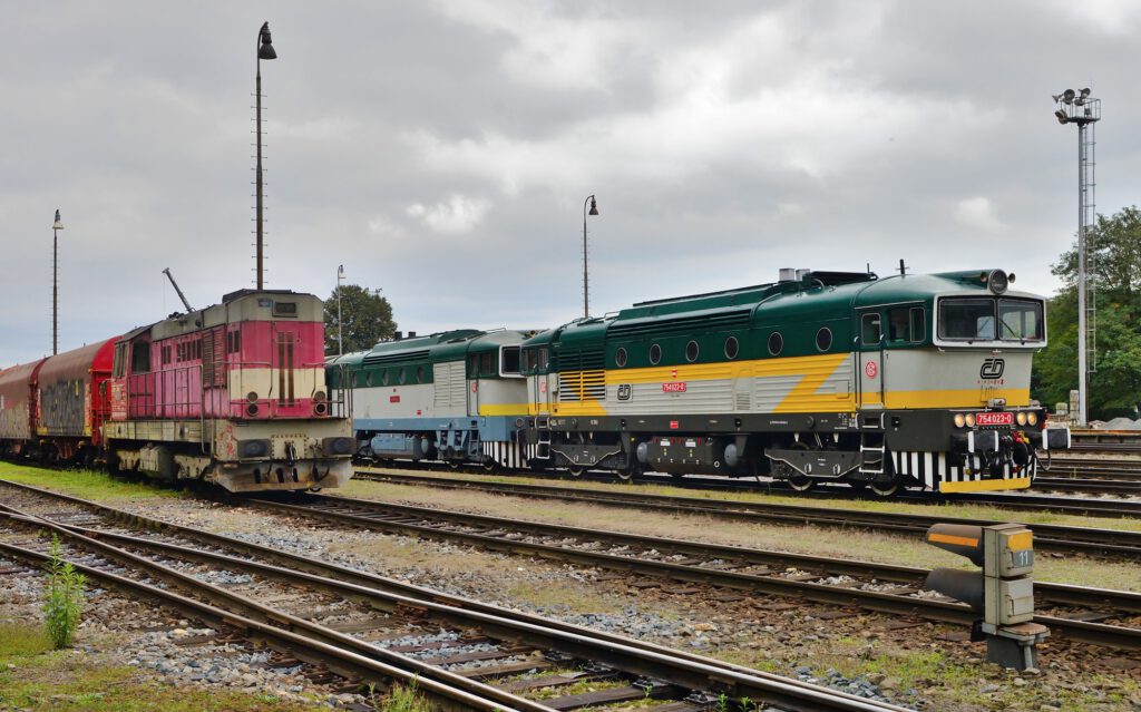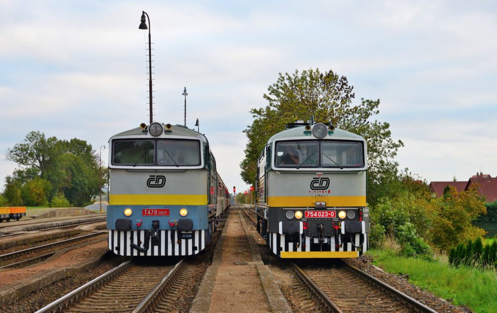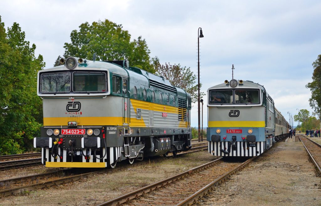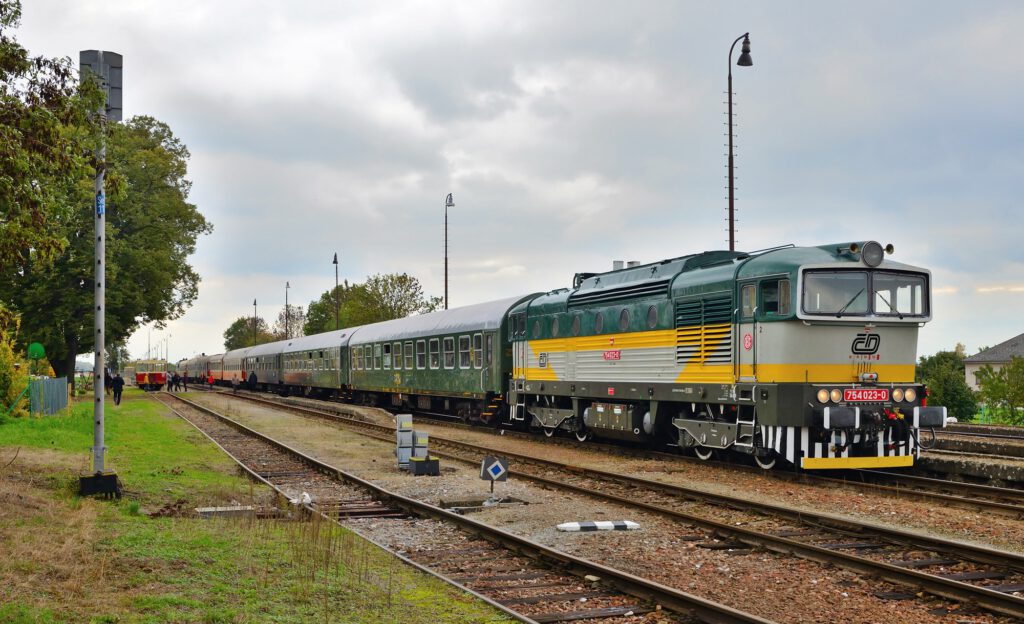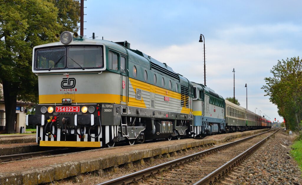 Am 11.10. wird unser Sonderzug nach Mlada Boleslav im Bahnhof Česká Lípa (Böhm. Leipa) von Dampf (35 1097) umgespannt auf die zwei „Taucherbrillen“ 753.001 und 754.023 der ČD-Nostalgie. Beide Loks befördern unseren Zug dann nach Mlada Boleslav (Jungbunzlau). Dort starten wir dann zu einer Rundfahrt über Veleliby, Jičín, Ostroměř und Městec Králové zurück nach MB. Dabei wird es auch Fotohalte geben, u.a. auch im Bahnhof Smidary mit alten Formsignalen.