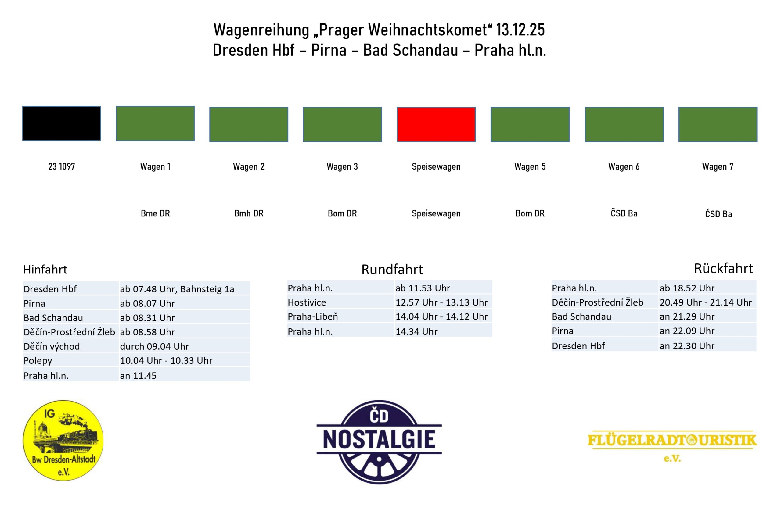 Hier nun die Fahrzeiten für den „Prager Weihnachtskomet“ am 13.12.25. Wir fahren auf der Hinfahrt rechtselbisch, also über Děčín východ, Litomerice, Všetaty und Neratovice nach Prag. Dabei machen wir im Bahnhof Polepy Halt, hier wird die Dampflok mittels Feuerwehr mit Wasser versorgt. Ab Prag gibt es dann eine Rundfahrt über Rudná u Prahy, Hostivice, Praha-Dejvice, den neugebauten Bahnhof Praha-Bubny, über das Negrelli-Viadukt nach Praha-Libeň und zurück zum Prager Hauptbahnhof.Die Rückfahrt ab Prag führt dann direkt über Kralupy und Děčín nach Hause.Ab/bis Prostřední Žleb läuft die „Taucherbrille“ 754.044 am Zugschluss mit. Zwischen Dresden und Bad Schandau läuft voraussichtlich die VIS-218 zum heizen der Wagen am Schluss mit.