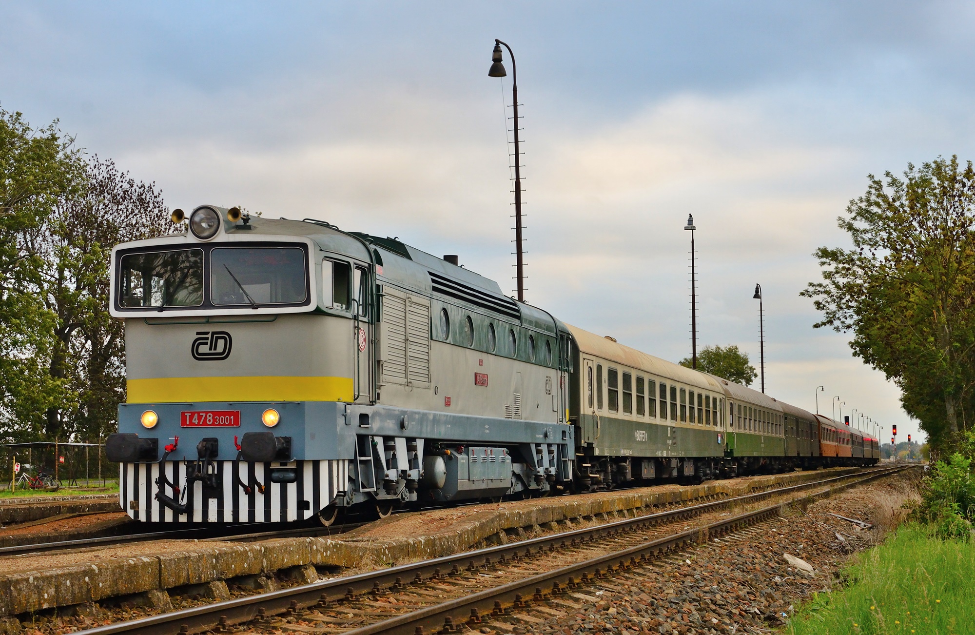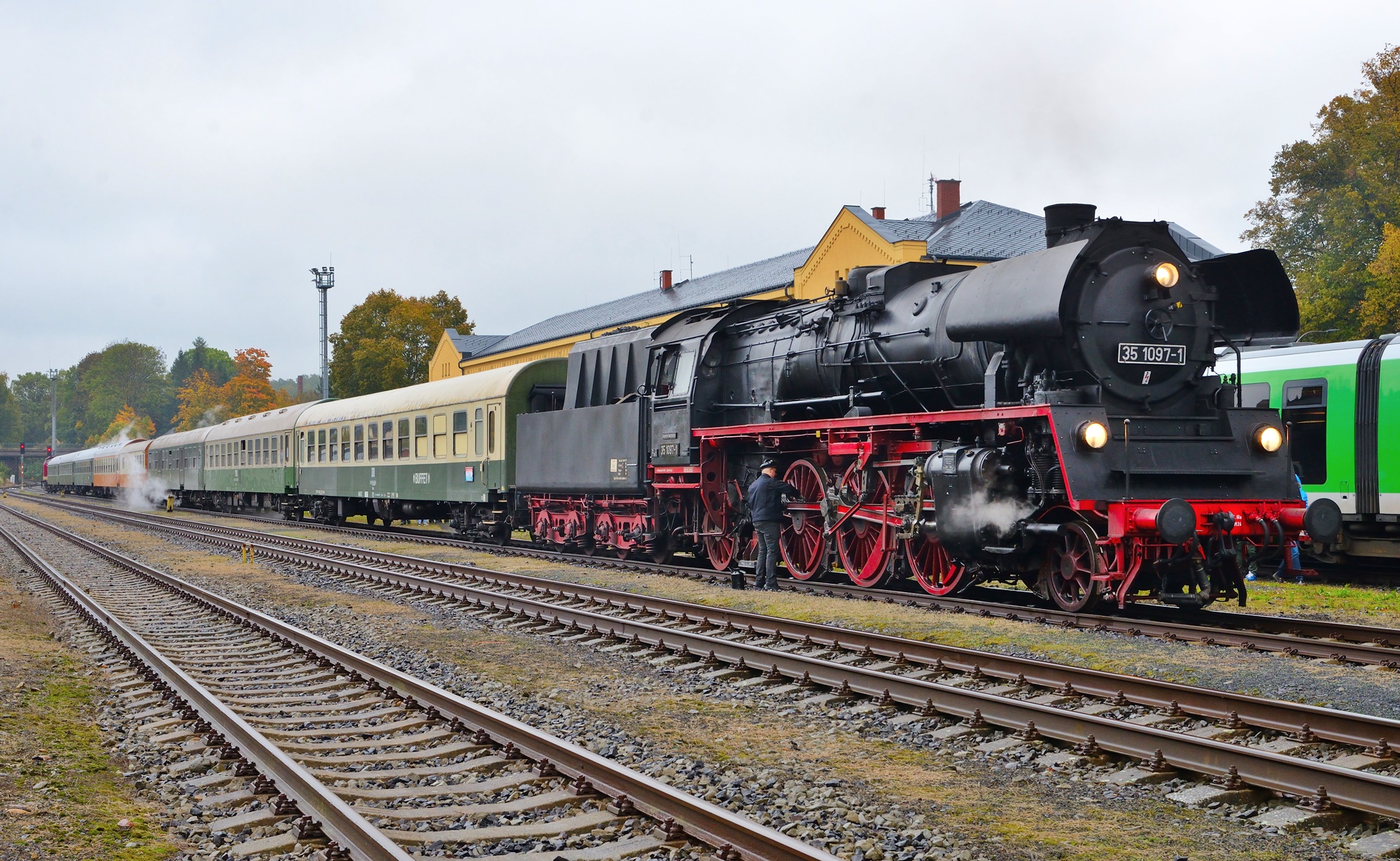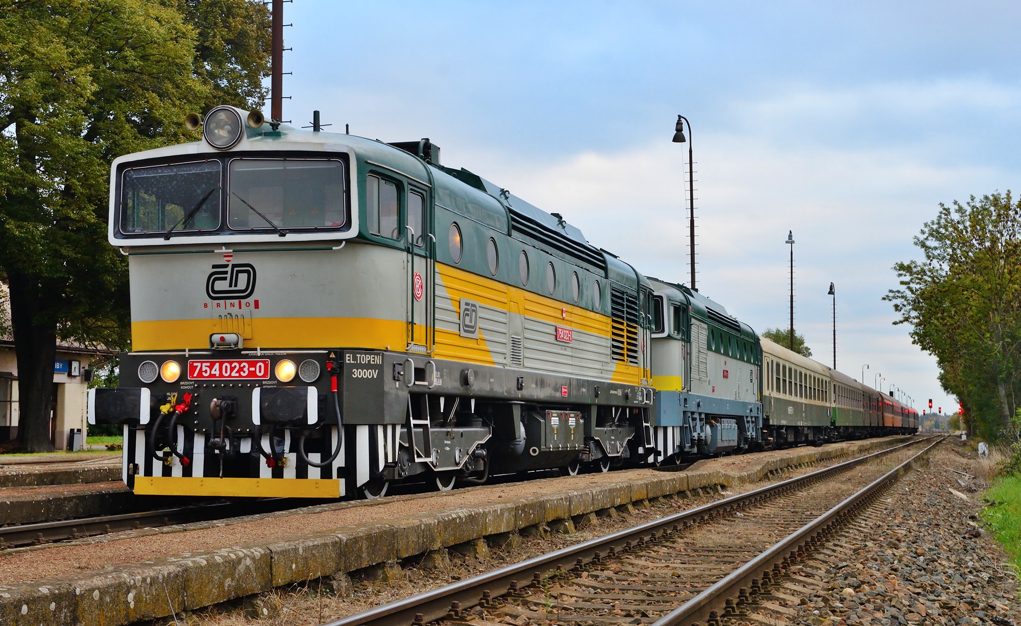 Am 11.10. wird unser Sonderzug nach Mlada Boleslav im Bahnhof Česká Lípa (Böhm. Leipa) von Dampf (35 1097) umgespannt auf die zwei „Taucherbrillen“ 753.001 und 754.023 der ČD-Nostalgie. Beide Loks befördern unseren Zug dann nach Mlada Boleslav (Jungbunzlau). Dort starten wir dann zu einer Rundfahrt über Veleliby, Jičín, Ostroměř und Městec Králové zurück nach MB. Dabei wird es auch Fotohalte geben, u.a. auch im Bahnhof Smidary mit alten Formsignalen.